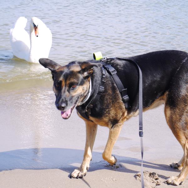 NADI zna wszystkie parki w Warszawie, ale również była już w niejednej CASTORAMIE, IKIEI - wszędzie tam, gdzie DOG's is frendly. NADI jest wytrawną automiblistką. Kocha jazdę samochodem i bardzo lubi morskie plaże nad Bałtykiem. Jest z nami wszędzie. Na zdjęciu bardzo zaciekawiona, próbuje się "pokolegować" z łabędziem na plaży niedaleko USTKI.